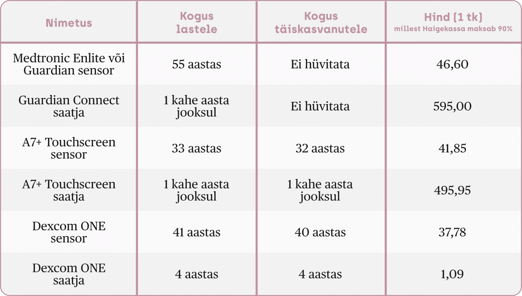 Eestis saadaolevad sensorid ja saatjad ning nende hüvitatavad kogused on järgmised: