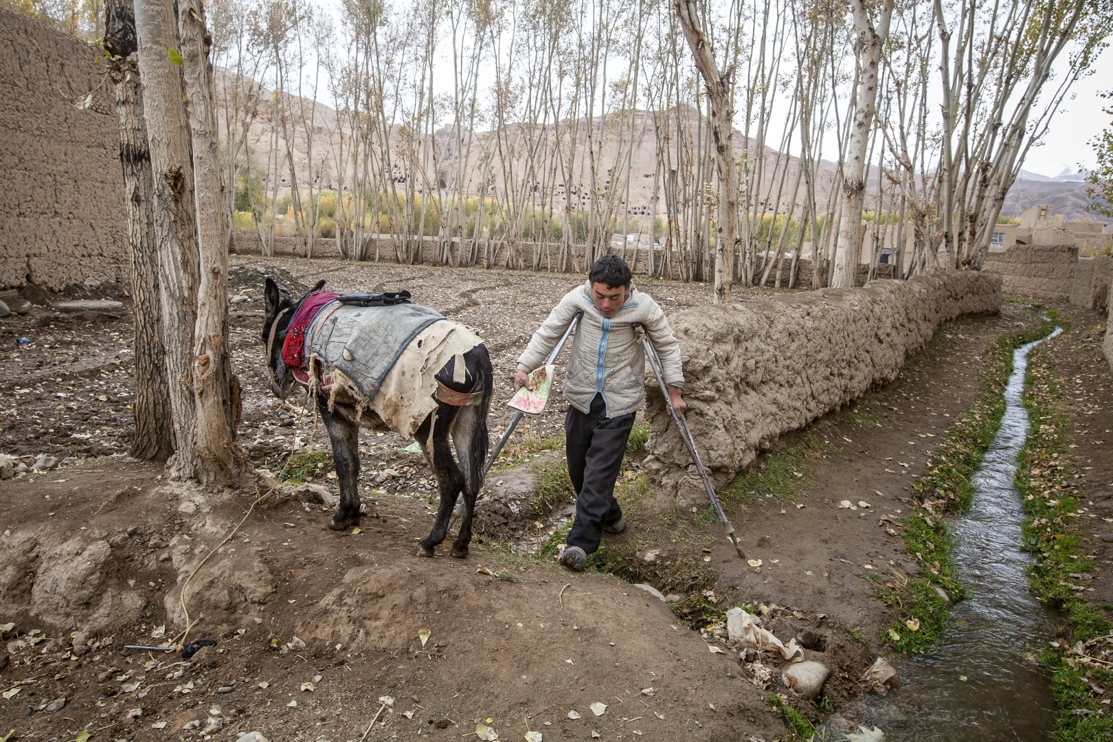 На этой фотографии Хаджи Ахмад прибывает в афганское объединение лиц, переживших подрыв на мине (ALSO), верхом на осле. Это его единственное средство передвижения. Здесь, в городе Бамиан он посещает курсы английского языка и компьютерной грамотности. Хаджи не знает, что случилось с его ногой. Он был слишком маленький и не помнит, а дома об этом никогда не говорили. Хаджи нуждается в носимых протезах для обеих ног. Это позволит ему передвигаться самостоятельно.