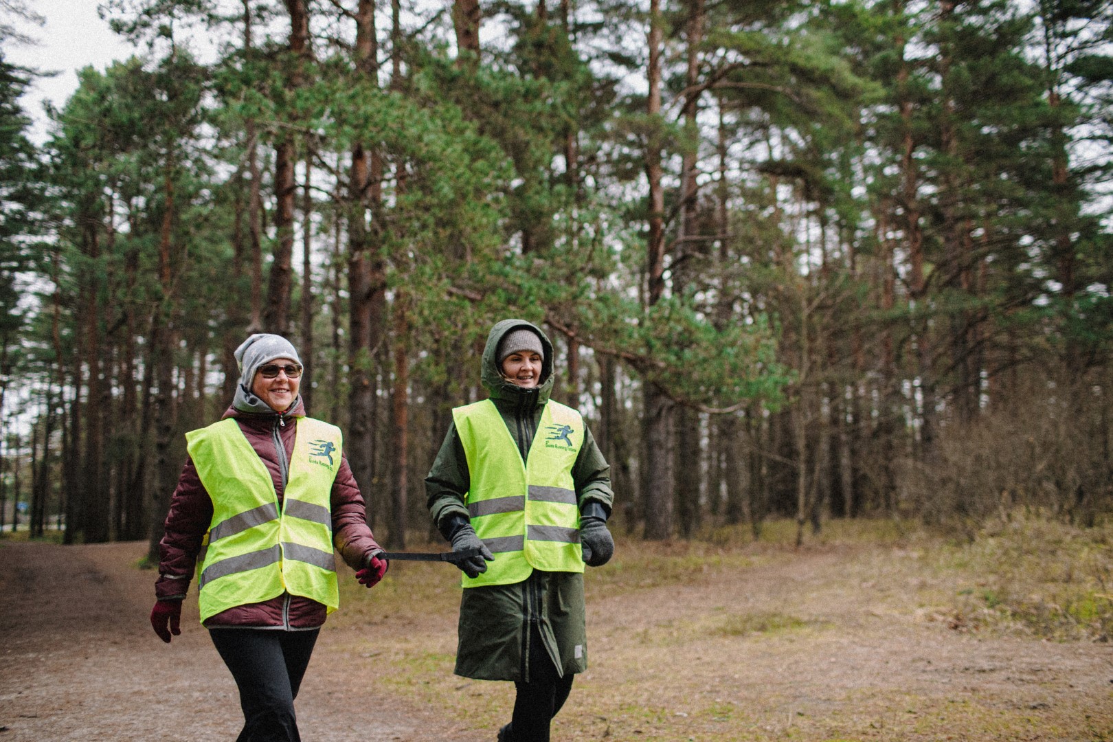Fotol: Kerti Kollom Seidelberg. Foto autor: Ken Mürk. PVC plaadile prinditud värvifoto. Formaat: A2 rõhtasendis (42x59,40cm). Foto kirjeldus: Sügisene männimets, liivane maastik. Hoogsal sammul liiguvad, mööda vasakult kulgevat metsarada, vaataja suunas, kaks naerusuist naisterahvast. Neist vasakpoolne, toonitud prillidega, on Kerti. Tal on peas hallipõhjaline, heledate viisnurkadega müts. Seljas tumepunane jope, mille peal kollane helkurvest. Vasakul hõlmal, rinna kõrgusel tumedat värvi, MTÜ Guide Running Estonia logo, mis koosneb ühingu nimest ja kahest teineteise kõrval jooksvast inimkujutisest. Naisel on jalas mustad püksid ja käes punased sõrmkindad. Tema vasaku käe sõrmed hoiavad kinni paarisentimeetri laiusest ja ligi 40 sentimeetri pikkusest kummipaelast. Kummipael on ühendavaks lüliks Kerti ja tema paarilise vahel. Parempoolsel naisel on peas hall soonikkoes müts, mille alt paistavad heledad juuksesalgud. Tumerohelise poolpika sügisjope kapuuts on mütsile omakorda katteks. Naisel on käes hallid, tekstiilist labakindad ja jalas mustad püksid. Parka peal on samasugune helkurvest nagu Kertil.