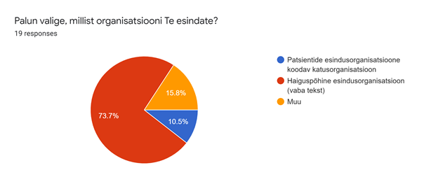 Küsimustikule, mis koosnes kahekümnest nii valikvastusega kui vaba tekstiga küsimusest, vastas 19 organisatsiooni, millest enamuse moodustasid haiguspõhised esindusorganisatsioonid. Vastuseid töötlesime anonüümselt ja agregeerituna statistilistel eesmärkidel vastavuses kohalike seadustega.